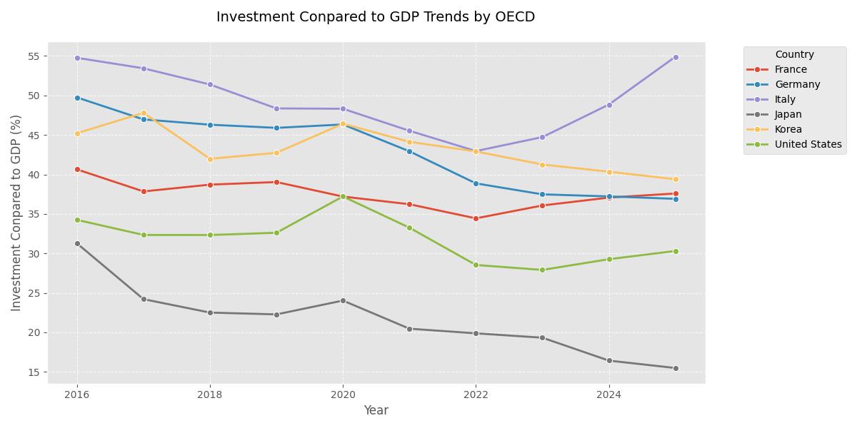 特に日本のGDP比の投資額の減少が顕著で、ここ3年で約GDPの5パーセントもの減少が見られる。