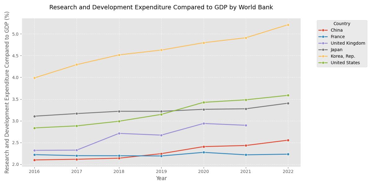 また、中国も研究開発費を増大させている。2016年ではGDP比2%程度と他国に比べて低い水準だったのが、2022年では2.5%程度と急増している。